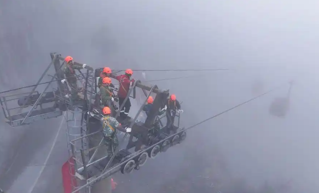 3月4日,張家界天門(mén)山索道在濃霧籠罩的環(huán)境中開(kāi)展了一場(chǎng)緊張而有序的救援演練,模擬在懸崖絕壁間營(yíng)救被困轎廂游客的情景。