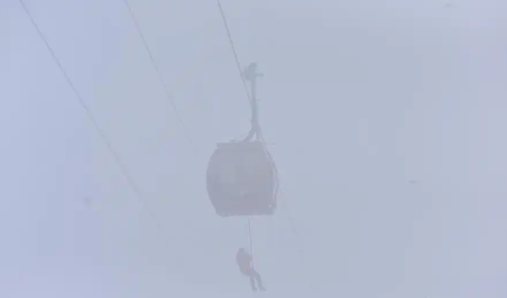 演習(xí)正式開(kāi)始,運(yùn)行中的天門(mén)山索道突然停止,模擬轎廂中的乘客被困。今日山頂飄雪,演習(xí)現(xiàn)場(chǎng)大霧彌漫,能見(jiàn)度極低,這為救援行動(dòng)增添了額外的難度和緊迫感。雖然現(xiàn)場(chǎng)氣溫接近0°,但救援人員已經(jīng)大汗淋漓。